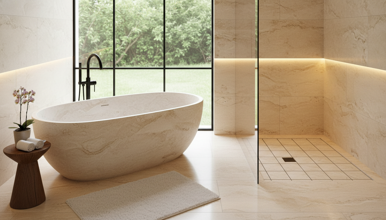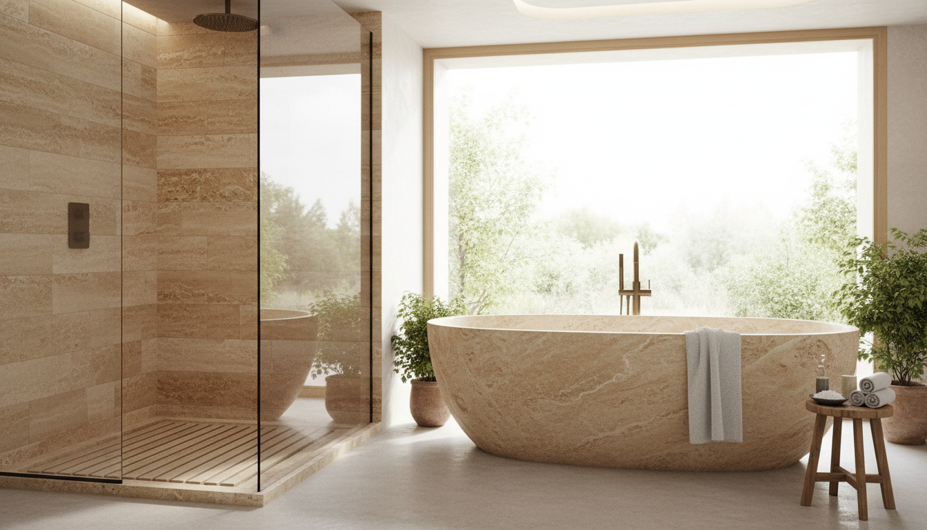 Eine Badewanne aus massivem Travertin ist ein zeitloses Stück, das Natur, Wärme, Schönheit und Eleganz in Ihr Zuhause bringt. Um diese Art von einzigartiger Badewanne zu erhalten, bieten wir bei Steinja fast ausschließlich Handarbeit an, um außergewöhnliche Oberflächen zu erzielen. Die Duschwannen aus Travertin sind sowohl ein stilvoller als auch ein wesentlicher Bestandteil Ihres Duschraums und spielen eine wichtige Rolle beim Ableiten von Abwasser und beim Schutz Ihres Badezimmerbodens.